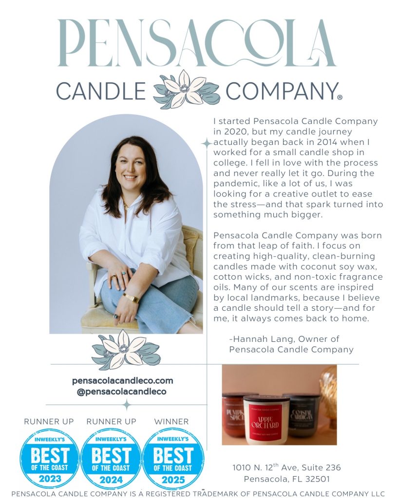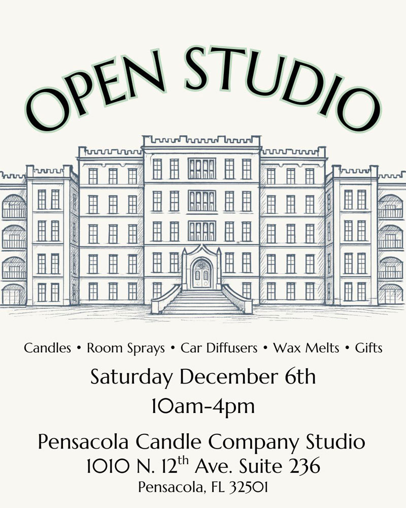 Join us for our Open Studio event! Explore candles, room sprays, wax melts, car diffusers, and more — the perfect gifts for the season.📅 Saturday, December 6, 2025🕙 10am–4pm📍 Pensacola Candle Company Studio