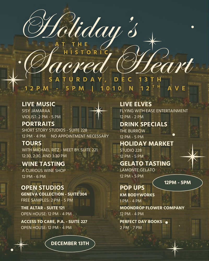 Holidays at the Historic Sacred Heart on Saturday, December 21st. Celebrate the holidays with us in Historic East Hill from 11 AM to 8 PM.